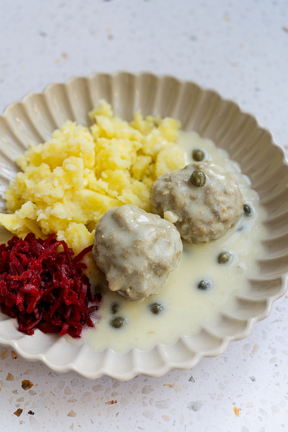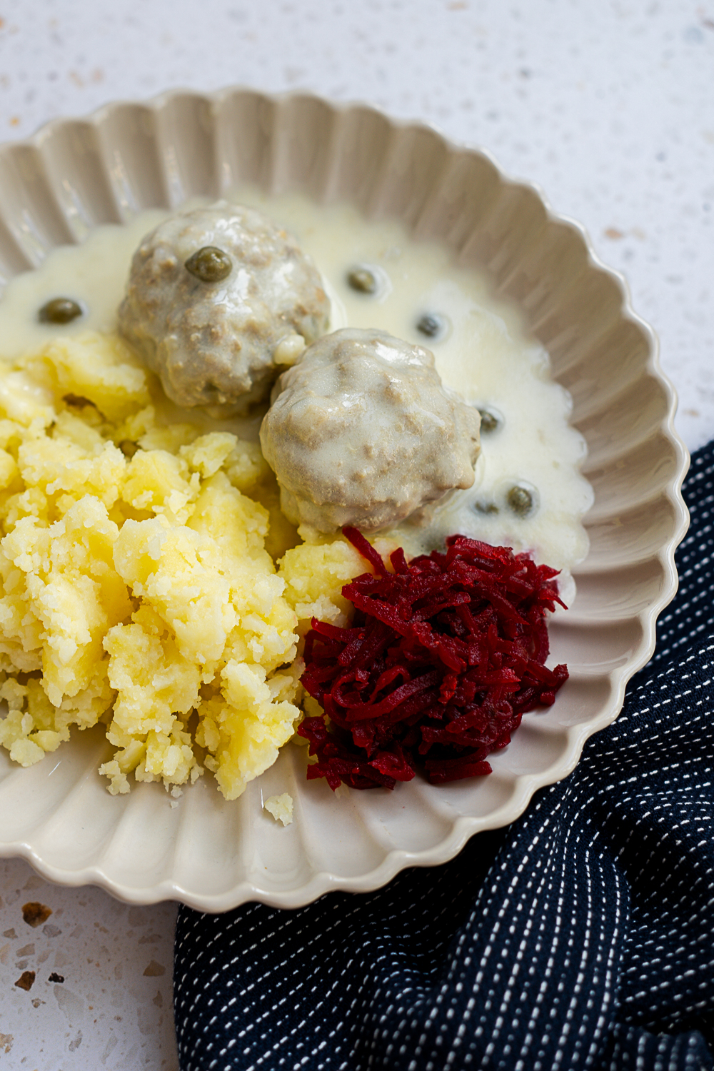 Einige Klopse ohne Kapern und Salz garen, anschließend fein pürieren und mit etwas Kartoffelbrei mischen. So können auch die Kleinsten am Familienessen teilhaben
